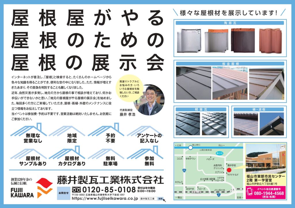 event 屋根展voi.99 in福山(東部市民センター) 開催日時 2024年6月6・7・8日(木・金・土)10時~16時 (会場:福山市東部市民センター(2階 第一学習室)) 詳しくはこちら > 藤井製瓦工業が福山市で定期的に開催しております、 屋根材・屋根工事に特化した展示会「屋根展」を 6月に2週連続で開催!! 第1週目は6月6・7・8日(木・金・土)10時~16時 福山市東部市民センターにて開催いたします。 雨漏り等のトラブルにお困りの方、実際に屋根材を見たい方お気軽にお越しください。 無理な営業、アンケートはいたしません、事前予約も不要です、お待ちしております(^▽^)/ 会場 福山市東部市民センター(2階 第一学習室) 会場住所 福山市伊勢丘六丁目6番1号 開催日時 2024年6月6・7・8日(木・金・土)10時~16時 参加費 参加費無料 アクセスマップを確認する >> 一覧へ戻る